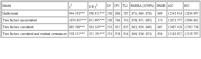 This study used the combined values RMSEA and SRMR as adjustment indicators (Hu & Bentler, 1999). Table 2 shows the goodness fit indexes obtained. The one-dimensional and two factor non-correlated model presented the least favorable indicators. AIC and BIC were estimated, in which the lowest value indicates the best model. In this study, it was the two dimensional with two interrelated and covariant factors; however, once the modification indexes were subsequently revised and residual covariances were implemented among the items that belonged to the same factor, better model fit indicators were obtained.