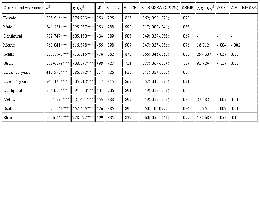 The confirmed model was reviewed in each nested group imposing progressive and sequential restrictions. Table 3 shows the χ2 and S-B χ2 (p<.01 y .001) values. The results suggest that the models should be rejected for statistically significant differences, although this indicator has been questioned for its sensitivity to sample size, the analysis of the progressive variations for each restriction imposed was continued, given that conclusions based only on the p-value may lead to the rejection of parsimonious and theoretically acceptable models. The R-CFI, R-TLI, R-RMSEA, and SRMR values showed optimal settings for the male group and under 25 years of age, while they were not acceptable for the other groups.