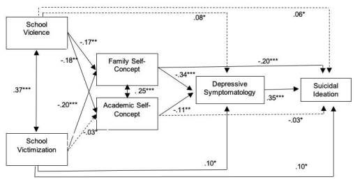 However, exerted school violence is not significantly related to suicidal ideation (β = .06, ns). Likewise, the family self-concept variable shows a direct and negative effect on suicidal ideation (β = .20; p < .001), while academic self-concept is not significantly related to suicidal ideation (β = .03, ns). On the other hand, the personal variable of depressive symptomatology showed a direct and positive relation with suicidal ideation (β = .35; p < .001).