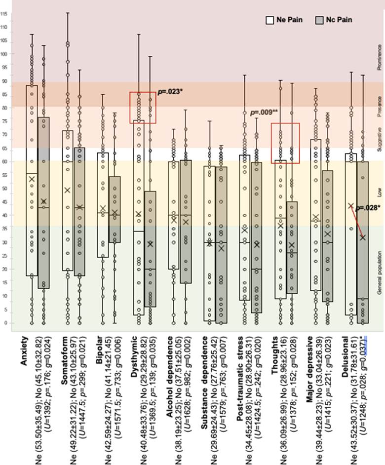 The scores averaged below 60, which corresponds tothose expected for the general population (0-34) and low(35-59, higher than the general population but not suggesting a disorder), with the highest scores for anxiety clinical syndrome (not significant). There were greater significant differences for the neuropathic group (median60; range 0-93) compared with the nociceptive group(median 9; range 0-92) in the delusional disorder scores(U= 1248;p=.028), with agof .037, indicating a small effect size. The neuropathic group showed significantly larger percentages in the 75-84 score range for the presence of the dysthymic clinical syndrome [26% vs. 9%for the neuropathic and nociceptive groups, respectively;χ2(1,N= 115) = 5.15,p=.023], with a low positive as-sociation (rφ=.212), and in the 60-74 score range suggestive of thoughts disorder [29% vs. 9%, respectively;χ2(1,N= 115) = 6.79,p=.009], with a low positive as-sociation (rφ=.243) (Figure 2).