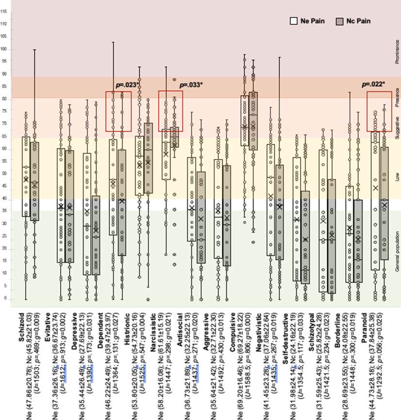 Most of the study participants tended to show a controlling, demanding, and perfectionist behavior, possibly resulting from a conflict between hostility (due to being forced to accept the imposition of chronic pain) and the fear of social disapproval (due to stigmatizing beliefs), increasing the demands and rigidity, with the idea of compensating for and minimizing the discomfort (Millon et al., 2009). This is similar to obsessivecompulsive personality disorder and coincides with previous results describing difficulties in acquiring coping strategies for pain (Ibrahim et al., 2020), manifesting with harm avoidance and low self-directedness (Gustin et al., 2015; Ibrahim et al., 2020; Kato et al., 2017; Naylor et al., 2017). Moreover, both groups tend to show narcissistic, histrionic, and schizoid attitudes. Therefore, the high prevalence of maladaptive scores could suggest that the stable predispositions that constitute personality have been affected by the chronic pain (Chang et al., 2017; González et al., 2007; Gustin et al., 2015; Ibrahim et al., 2020). Although both groups show multiple relationships, the scores indicative of depressive and anxiety psychopathology suggest greater involvement for the clinical syndromes and personality patterns of the neuropathic group, showing that when faced with neuropathy and comorbidity, the clinical condition is aggravated and the prognosis worsened (Aho et al., 2022; Chang et al., 2017; Colloca et al., 2017; Galli et al., 2021; Park et al., 2020; Yang et al., 2019).
