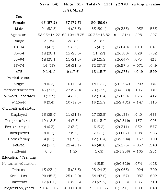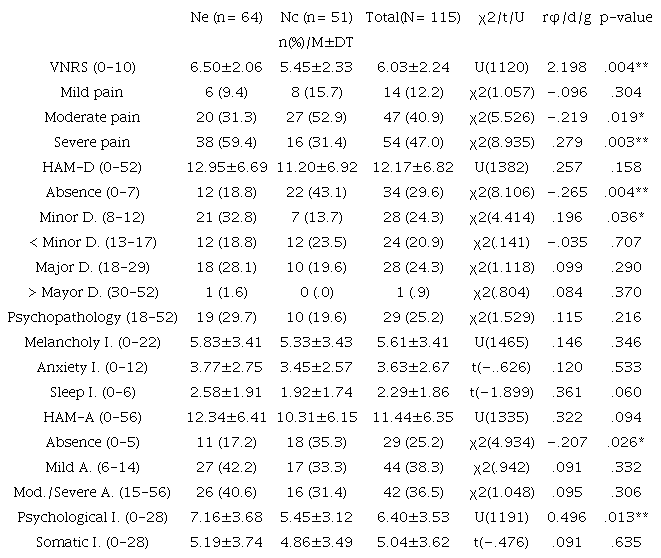 The demographic data met the normality of distribution criteria, showing a predominance of the female sex in both groups, with a mean age of 58.95 (SD, 14.22) years in the neuropathic group and 62.10 (SD, 13.25) years in the nociceptive group. The percentage of un married/unpartnered participants in the nociceptive group was statistically larger [19.6%;χ2(1,N= 115) = 4.73,p=.030], with a low negative association (rφ=−.203),while the percentage of married/partnered participants was statistically larger in the neuropathic group [71.9%;χ2(1,N= 115) = 4.38,p=.036], with a low positive association (rφ=.195). The pain progression, in years, was longer in the neuropathic group (mean, 5.64;SD, 9.16)than in the nociceptive group (mean, 4.93;SD, 8.06), al-though it was not statistically significant (ns) (Table 1).