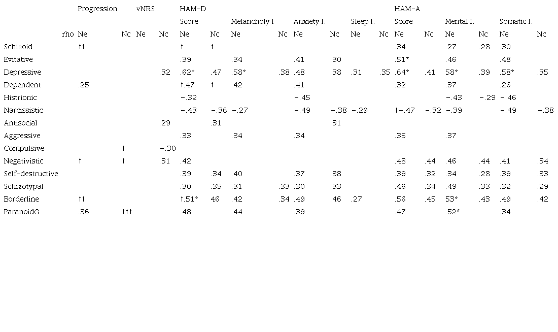 The clinical syndrome scales (Table 3) revealed significant, positive, and strong correlations for the neuropathic group, which related the somatoform clinical syn-drome with the HAM-D score (rho(62)=.751;p=.000)and the major depressive clinical syndrome with the HAM-A score (rho(62)=.716;p=.000) and with its internal indices of mental anxiety (rho(62)=.714;p=.000). The neuropathic group showed 28 moderate positive correlations for HAM-D and HAM-A with clinical syndromes (anxiety, somatoform, dysthymic, PTS, thoughts, and major depressive). The nociceptive groups howed 15 moderate positive correlations for HAM-Dand HAM-A with clinical syndromes (anxiety, dysthymic, thoughts, and major depressive). The personality pat-tern scales (Table 4) showed 10 moderate positive correlations for the neuropathic group, relating the depressive personality pattern with HAM-D scores, internal indices of melancholy and with the measures of HAM-A; relating the borderline personality pattern with the scores for HAM-D, HAM-A and internal indices of mental anxiety; and relating the evitative personality pattern with the HAM-A scores and the paranoid personality pattern with the internal indices of mental anxiety.