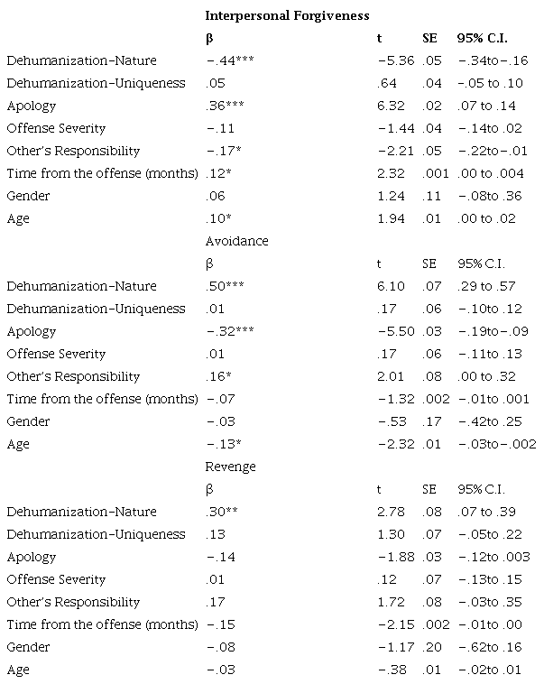 Conclusions. : The results revealed a role for dehumanization (nature) in predicting the victims’ interpersonal forgiveness, avoidance, and revenge intentions. Implications for further research are discussed.