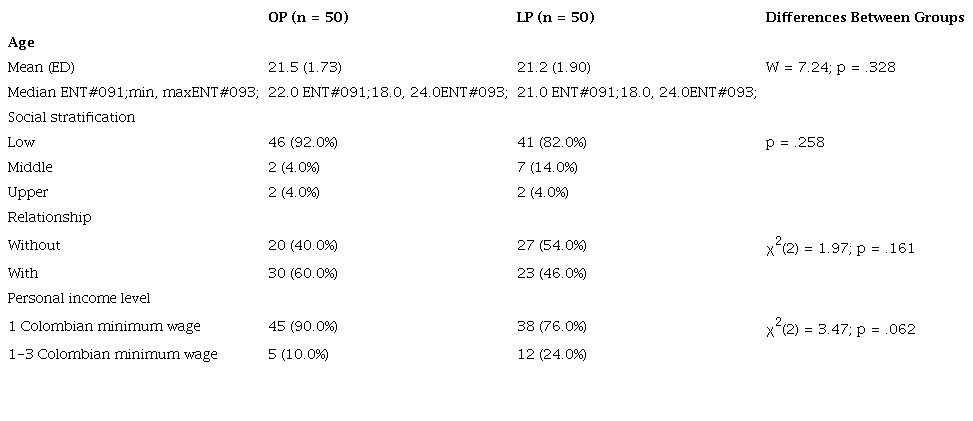 The research had the participation of 100 students, with an average age of 21.3 years (+1.81). 50 participants were in OP and 50 in LP at the time of presenting the task. Table 1 presents the sociodemographic description of the groups. No statistically significant evidence of differences in the median ages was found, nor in the proportions of socioeconomic stratum, couple relationship or level of personal income. In the comparisons, the Mann-Whitney U test was used for scale variables (i.e., age), Fisher’s exact test for qualitative variables with less than five data in one of the categories (i.e., stratum) and the Pearson’s chi-square test for the remaining qualitative variables (i.e., partner relationship and personal income level).