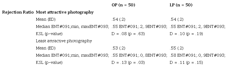 To contrast the hypotheses, the percentage of rejection in each of the phases and conditions for the participants was compared. Table 2 presents a summary of the performance in each group, as well as the result of the Kolmogorov-Smirnov-Lilliefors test of normality. Statistically significant evidence was found to affirm that the proportion of rejection of the OP participants, in the condition of photographing a more attractive woman, did not come from a normally distributed population. For the other conditions in the same group and in the participants in LP, no statistically significant evidence of breach of the normality assumption was found (see Table 2).