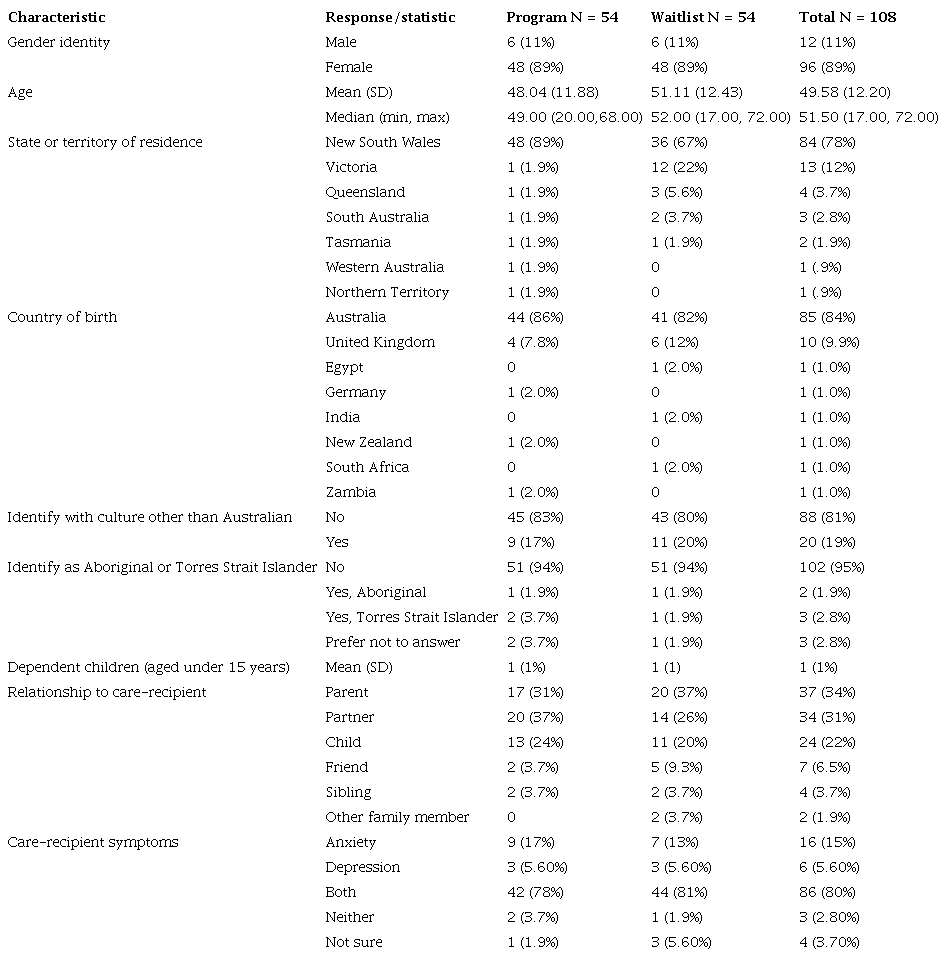 One hundred and eight participants (89% female) were recruited and randomised to either the Intervention (n = 54) or Waitlist groups (n = 54). The mean age of participants was 50 years (SD = 12.2, range = 17-72). Most participants were born in Australia (84%) and identified as Australian (81%), with almost 5% also identifying as Indigenous Australian (1.9%, Aboriginal; 2.9%, Torres strait Islander). Participants resided in all states and territories in Australia but were mainly living in New South Wales (78%) and Victoria (12%). Many participants were the parent (34%), or partner (31%) to the care-recipient and 80% supported someone with comorbid depressive and anxiety symptoms. More demographic data is included in Table 1.