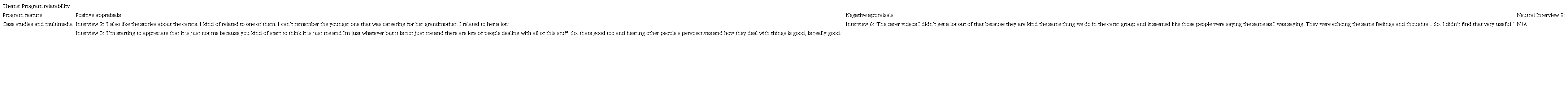 The theme of accessibility summarised participants’ comments on the program’s content and structure. Almost all (80%) of carers commented positively about the content relevance and structure, such as “the language was so accessible” (Female, 61, supporting her child with depression and anxiety), and “the whole program was structured well” (Male, 68, supporting his partner with depression and anxiety). However, some carers experienced some technical issues completing activities and downloading resources.