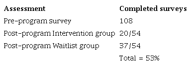 Secondly, the study and program design may have influenced study results. For example, Waitlist participants were required to complete the post survey before gaining access to the program. There is other evidence that a Waitlist control design can build participants’ eagerness to access the intervention, which might account for the higher survey completion rates for this group (Jensen et al., 2016). Contrarily, some participants reported missed emails and technical issues on the platform (e.g., loading links and pages, and saving responses to activities), which could have negatively impacted their engagement (Wagenaar et al., 2017). A subsequent study should employ an active comparator arm and address platform technical issues to address the impact of these variables on study results.