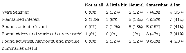 Finally, participant attrition may have introduced positive bias toward acceptability results because respondents to the satisfaction measure and interviews only represent a portion of the participants overall. Specifically, 53% of participants who activated their program accounts also responded to the satisfaction measure and interview participants comprised just 31% of those who activated their program account. It is possible that carers who completed the measures experienced more satisfaction than those who dropped out of the study, which may introduce positive bias toward participant feedback. A future study should address this limitation by focussing on improving study retention, such as through phoning participants throughout the study period to check if they need assistance.