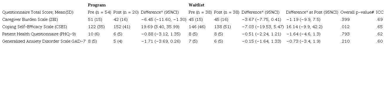 The Intervention group reported a significant reduction in ZBI scores of the caregiver burden subscale from pre to post (49.8 vs 43.3, p = .015). The Waitlist group had a (non-significant) reduction in score, and the overall treatment effect was not significant (p = .399).
