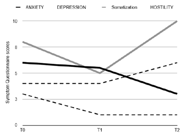 As for the descriptive analyzes conducted on the psychopathological symptoms, interesting aspects emerged. First, high levels of anxiety and somatizations highlighted the anxious hyper activation that characterizes the pre-operative period. Furthermore, a slight decline in mood was also noted. In fact, it is possible to hypothesize that the preparation for the intervention generates fears and concerns and that this condition remains substantially stable for the two weeks considered, from T0 to T1. Even though on a qualitative level, an opposite trend emerged by observing the scores of the last administration. At the time of discharge, the anxious hyper activation is replaced by a notable increase in symptoms of depression and somatizations. Understandably, the somatic symptoms increase within the outcome of surgery and, in addition, they are accompanied by a noticeable change in mood. Hence, it is possible to hypothesize that the mood is affected by the presence of painful symptoms that are annoying. Moreover, the limitations resulting from the surgical operation and the medical indications that are usually provided (remain at rest, do not make efforts, etc.) can also generate sadness and perception of disability that can be debilitating it selves.