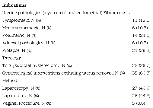 In this observational and cross-sectional study, 58 women, aged between 28 and 59 years old (mean 41.5±8.8), that should have undergone a gynecological surgical intervention (conservative or non-conservative) for benign pathologies were consecutively recruited from the Obstetrics and Gynecology Unit of the Hospital of Carpi (Modena, Italy). The criteria for the inclusion in the study were: Italian nationality or good comprehension of Italian language; absence of sensory disturbances of sight and/or hearing that limit the administration of the tests (i.e. previous head trauma, neurological condition, alcoholism or substance abuse, or neoplasms); age from 28 to 60 years; either fertile age or menopause; conservative and non-conservative gynecological interventions for uterine pathologies (myometrium and endometrial), and benign adnexal pathologies, and prolapse with methods of the intervention being laparotomy, laparoscopy, or vaginal procedure. Women that underwent gynecological surgical interventions for neoplasm, examinations of the uterine cavity, sterilization, and post-partum complications were excluded from the sample.