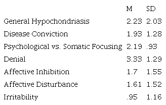 The Illness Behavior Questionnaire (IBQ; Fava et al., 1982; Pilowsky & Spence, 1994) quantifies aspects of the way individual experience and respond to their health status and can also be used as a screening instrument (Pilowsky et al., 1984). It is a 62-items questionnaire that was originally developed as an expansion of the 14-item Whiteley Index of Hypochondriasis (Pilowsky, 1967). The 52-item original version was expanded to 62items to ensure that each of the seven scales comprised at least 5 items. The scales were derived from a factor analytic study of the responses of 100 pain clinic patients, and have derived support from two independent studies. The validity and reliability of the scales are described in detail in the Manual for the Illness Behavior Questionnaire (Pilowsky & Spence, 1994). The resultant 62-item IBQ comprises seven primary scales: General Hypochondriasis (GH), Disease Conviction (DC), Psychological vs. Somatic Focusing (SF), Denial (D, purported to be direct measures of illness behavior), and Affective Inhibition (AI), Affective Disturbance (AD, or Dysphoria), and Irritability (I, measures of affect). Two second-order factors are also commonly derived from the IBQ. Disease Affirmation is a composite measure comprising Disease Conviction and Psychological vs. Somatic Focusing, while Affective State consists of General Hypochondriasis, Affective Disturbance, and Irritability. The cut-off scores used in the present research were obtained from a study conducted on internal medicine patients by the authors of the instrument and correspond to GH=3.44, DC=2.9, SF=2.82, D=4.5, AI=4.12, AD=4.4, I=4.56. Cronbach’s alpha ranges between .71 and .89 for each sub-scale.