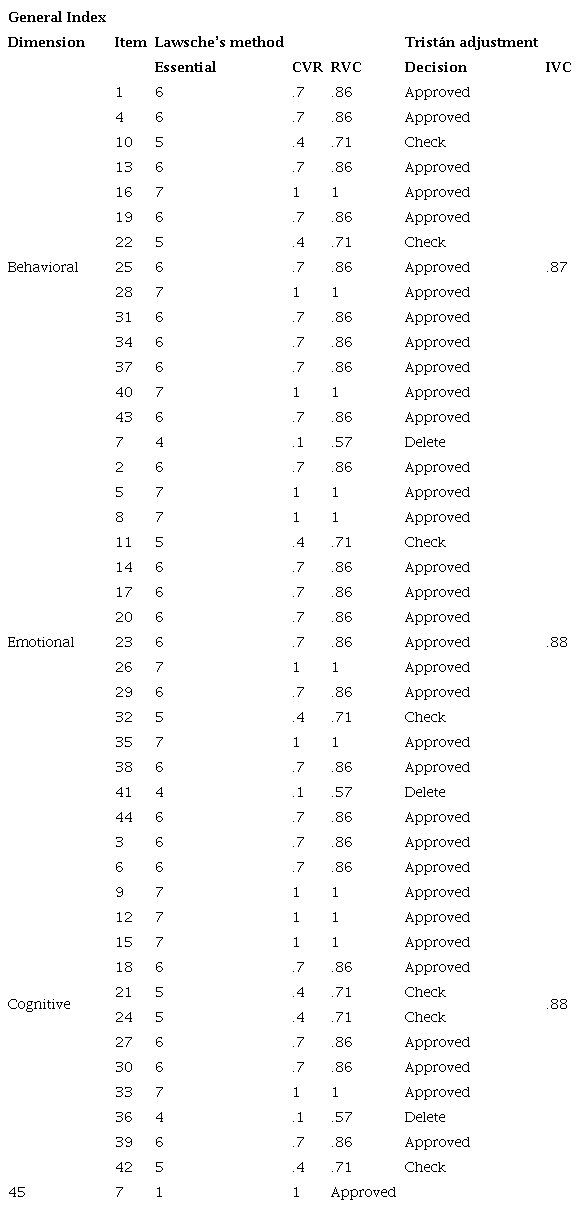 The methodology used for the content-based evidence was the one proposed by Lawshe (1975) and modified by Tristán (2008). This methodology allow to establish the index of agreement by considering the evaluation that the seven experts made of each item of the three dimensions that make up the test. The experts classified each item as essential, useful but not essential, and not necessary. After this classification, the content validity ratio (CVR) was calculated, which according to Tristán is considered acceptable if its value is higher than .58. Likewise, it was considered that an index lower than .8 and higher than .58 indicates the revision of the item. Finally, the content validity index (CVI) per dimension was calculated, taking into account the validity ratio of the items for revision or approval; an index equal to or higher than .8 is considered adequate. This evidence made it possible to improve the content of the items.