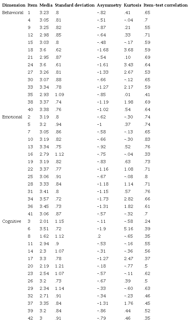 The instrument was structured as follows. The behavioral dimension takes up the definition of behavior given by Watson, which is: “what the organism does or says”. He goes on to clarify that “to speak is to do, that is, to behave” (Watson, 1961, p. 23). In this order of ideas, this dimension consists of statements that refer to actions and/or are related to what to do at work with items 1, 4, 10, 13, 16, 19, 22, 25, 28, 31, 34, 37, 40, 43 and 7. An example of an item of this dimension is: “I make an effort to do my job well”.