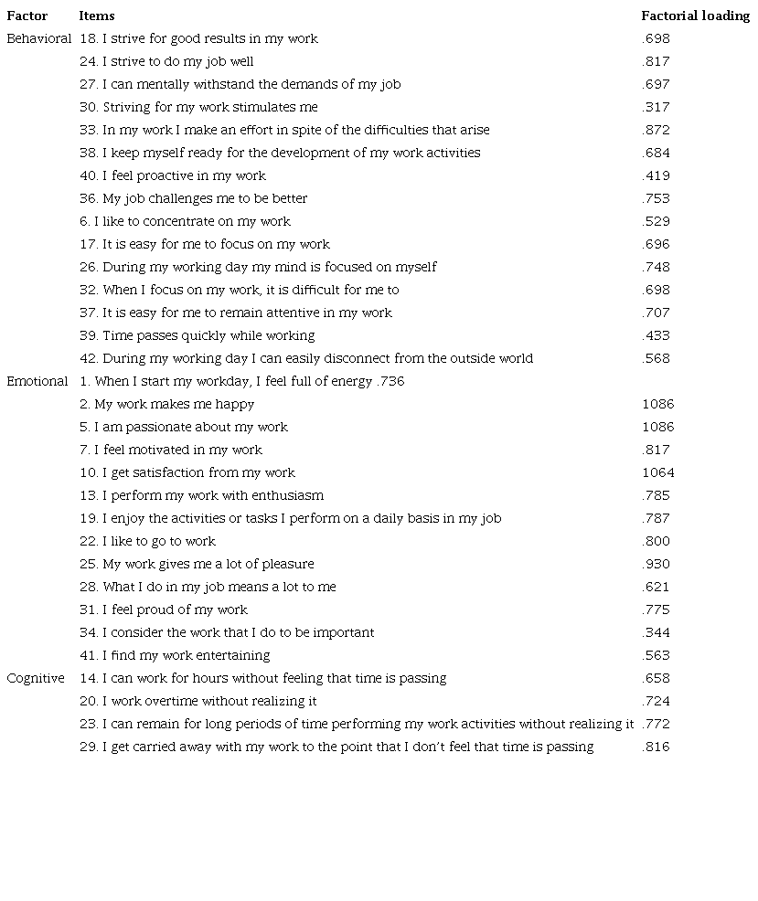 This manuscript shows the results of a research process that aimed to build and validate through evidence, such as content and internal structure, an instrument to assess work engagement in the Colombian working population, belonging to organizations from different economicsectors. After the evidence of internal structure through exploratory factor analysis, this tool was structured in three factors and 32 items as follows. The behavioral dimension contains items 18, 24, 27, 30, 33, 38, 40, which are part of the initial theoretical proposal; it should be noted that item 36, which belonged to the emotional dimension, and items 6, 17, 26, 32, 37, 39, and 42, which belonged to the cognitive dimension, were also grouped in this factor. An example of an item of the behavioral dimension is: “In my work I persist until things go well for me”. The affective dimension was made up of items 2, 5, 7, 10, 13, 19, 22, 25, 28, 31, 34, and 41, which coincided with the theoretical proposal and item 1 of the behavioral dimension was added. An example of an item of this dimension is the following: “I feel proud of my work”. And the cognitive dimension was organized with items 14, 20, 23, and 29. An example of an item of this dimension is: “I get carried away with my work to the point that I don’t feel that time is passing”.