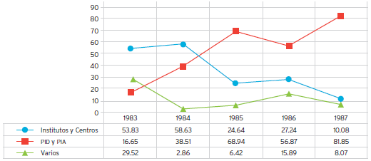 El segundo eje de acción del CONICET con la asunción del gobierno democrático giraba en torno al restablecimiento de la vinculación entre el organismo y las universidades nacionales. El primer hecho que cristalizó esta prioridad fue la celebración del acto de traspaso de las autoridades del CONICET en el salón de actos de la Facultad de Ingeniería de la UBA, en 1984. Las medidas que mayor peso tuvieron en el intento de promover la investigación en grupos o instituciones que no pertenecían al CONICET, fueron los Proyectos de Investigación y Desarrollo (PID), creados en 1984 y destinados a grupos de investigación ya consolidados, y los Proyectos de Investigación Anuales (PIA), creados en 1987 y orientados a grupos de investigación recientemente creados o en formación. Ambos mecanismos buscaban incluir explícitamente a los investigadores universitarios mediante la celebración de un concurso abierto en el que la pertenencia o no al CONICET no formaba parte de los criterios de evaluación. Se otorgaron 1 127 PID y 575 PIA entre 1986 y 1988 (CONICET, 1989b). La distribución por disciplinas muestra que los PID fortalecieron aún más las áreas disciplinares ya consolidadas, como las ciencias médicas, químicas, biológicas, ingenierías y tecnologías, mientras que los PIA (orientados a grupos en formación) tendían a favorecer las ciencias sociales y las humanidades. En conjunto, ambos subsidios comenzaron a superar al resto de los financiamientos que otorgaba el CONICET (gráfica 2), sobre todo aquellos destinados a los institutos propios que establecían como requisito de acceso ser parte del Consejo mientras que los nuevos proyectos eran abiertos a la comunidad académica (incluidas las universidades).