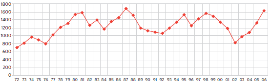 La evolución de los miembros de la carrera del investigador desde mediados de los años setenta hasta finales del periodo que estamos analizando13 (gráfica 1) muestra que el número de investigadores había crecido de manera sostenida previamente a la restauración democrática mientras que, a partir de 1984, la curva muestra cierto estancamiento acorde con la crisis económico-financiera por la que atravesaba el país y el sector de ciencia y tecnología. En 1988 la situación presupuestaria de la institución llevó a la decisión de establecer cupos para el ingreso en la carrera y esto reforzó la tendencia anterior. Hacia mediados de los noventa el estancamiento comienza a revertirse y desde 2003 podemos observar claramente la expansión y el crecimiento sostenidos, coincidente con el incremento presupuestario y la reestructuración del área de ciencia y tecnología que describiremos más adelante.