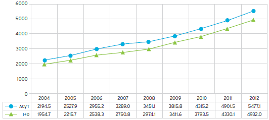 En la gráfica 4 la evolución del gasto realizado por diversos organismos de ciencia y tecnología para las actividades científicas y tecnológicas y para investigación y desarrollo muestran un crecimiento progresivo y sostenido durante el periodo con un impulso mayor desde 2006-2007 y con mayor peso del financiamiento orientado a actividades científicas y tecnológicas. Si analizamos estos gastos por institución destinataria observamos que esta expansión se ha canalizado principalmente a través de las universidades nacionales: en 2012 las universidades nacionales absorbieron el 27.2% del gasto en ACyT y el 29.6% del gasto en I+D mientras que el CONICET fue destinatario del 14.5% y el 15.8% respectivamente.
