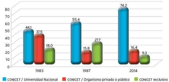 El proceso de institucionalización de las actividades de investigación en Argentina comenzó a mediados del siglo xix con la creación de los primeros institutos estatales en el ámbito de defensa, coincidiendo con la etapa de integración y expansión nacional. Desde ese momento hasta la actualidad este proceso atravesó diferentes etapas entre las cuales se destaca el periodo de la última dictadura militar (1976-1983), que se convirtió en un punto de inflexión porque se profundizaron procesos que dieron como resultado una reestructuración profunda del campo científico-universitario. Inicialmente, se produjo una transferencia de recursos presupuestarios desde las universidades nacionales hacia el Consejo Nacional de Investigaciones Científicas y Técnicas (CONICET) que facilitó la expansión y crecimiento de este último organismo en detrimento de las primeras. Pero, además, esta expansión no fue homogénea sino que se caracterizó por una marcada heterogeneidad estructural (geográfica, disciplinar, institucional). Una de las principales consecuencias de estos hechos fue el distanciamiento entre ambas instituciones lo que se tradujo en una escisión entre investigación y docencia.2 Con el reinicio de la democracia en 1983 se sucedieron nuevas tendencias y se acentuaron otras que fueron reconfigurando la dinámica y estructura del campo científico-universitario.