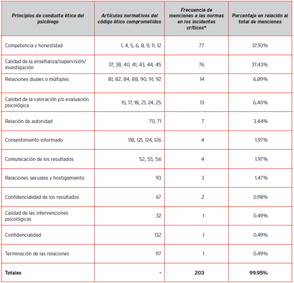 En una investigación realizada por la Sociedad Mexicana de Psicología (2009: 17) se solicitó a sus afiliados que describieran brevemente incidentes que hubieran entrañado una preocupación ética. De manera sintética, el 34% se relacionó con la incompetencia profesional; el 23% a faltas éticas vinculadas con cuestiones académicas y científicas, incluyendo el plagio; el 16% a hostigamiento y relaciones sexuales de psicólogos con pacientes y estudiantes; el 12% al uso de pruebas psicológicas y a su interpretación; el 8% a relaciones ambiguas entre terapeuta y paciente; el 5% a la confidencialidad y el 1% a un manejo no ético de cuestiones culturales.