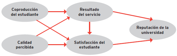 Por lo que se aprecia en el modelo propuesto por Duque (2003), la reputación de la universidad se constituye con base en la satisfacción del estudiante (usuario) y del resultado del servicio. Pero este último factor, influye en la reputación tanto directamente como a través de la satisfacción del estudiante, teniendo por lo tanto una influencia doble, mientras que la satisfacción del estudiante se vuelve central y se complejiza al ser afectada por las tres dimensiones o factores: el ya mencionado resultado del servicio junto con la coproducción del mismo estudiante y su percepción de calidad.