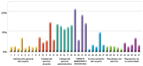 El cuestionario consta de 37 afirmaciones, ordenadas por dimensiones: de la 1 a la 7 corresponden a la satisfacción general del usuario; de la 8 a la 13 a la calidad del servicio docente; de la 14 a la 18 pertenecen a la calidad del servicio administrativo; de la 19 a la 22 a la calidad del servicio de equipamiento e infraestructura; de la 23 a la 27 a nivel de involucramiento (coproducción); de la 28 a la 32 forman parte de la evaluación de los resultados y, finalmente, de la 33 a la 37 se refieren a la reputación de la institución.