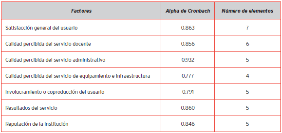 Para aplicar el modelo se procedió a elaborar un cuestionario (autoaplicado), se adaptaron los reactivos a la realidad universitaria nacional, luego de lo cual se aplicó a una muestra piloto de 30 estudiantes de la universidad en estudio, para validar el instrumento elaborado. De este modo, con los resultados de la aplicación piloto se obtuvo la confiabilidad y validez preliminar del instrumento. En términos de confiabilidad se obtuvo un Alpha de Cronbach de 0.89, lo que indica que el instrumento posee una alta consistencia interna entre sus reactivos. En términos de validez, se aplicó un Análisis Factorial Exploratorio para analizar el comportamiento de los factores arrojados en el análisis estadístico con el constructo teórico. A través de este análisis se pudo corroborar un adecuado agrupamiento de los reactivos del cuestionario en relación con el constructo teórico, salvo la excepción de la "calidad percibida del servicio", ya que en el instrumento original se medían en el mismo factor el servicio docente, administrativo y de equipamiento e infraestructura, los cuales para nuestra aplicación tuvieron agrupamientos separados, por tanto, en el cuestionario definitivo el factor "calidad percibida del servicio" se encuentra subdividida en estos tres factores.
