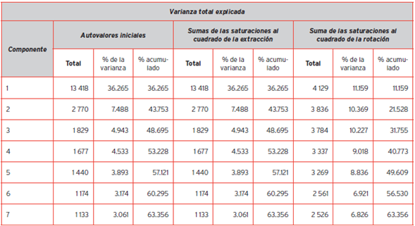 El Análisis Factorial con el método de extracción del Análisis Componentes Principales, determinó un modelo en que los factores explicativos son siete, como se aprecia en la tabla 3. Es decir, este modelo arroja que existen siete factores con poder explicativo mayor al de una variable. Se puede apreciar en la matriz sin rotar que el primer factor termina explicando más del 36% de la varianza común, mientras que el factor con menor poder explicativo lo hace con un 3%; en total, el modelo a través de los siete factores explica un 63% de la varianza común entre las variables.