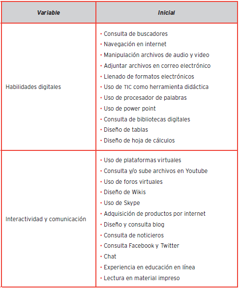 Los instrumentos utilizados para la medición consistieron en dos cuestionarios semiestructurados aplicados en dos momentos. El cuestionario de entrada consta de 25 preguntas y sirvió para detectar la población con las características requeridas: estudiantes del primer ciclo de la licenciatura en Mercadotecnia, usuarios frecuentes de la red, y con respuestas afirmativas al 70% del cuestionario de entrada. En un segundo momento se administró un cuestionario con diez preguntas semiestructuradas basado en las siguientes categorías: actividad en las redes sociales, cambio en las dinámicas familiares, nuevas necesidades a partir del uso de las tecnologías de la información y de la comunicación, consideración del entorno.
