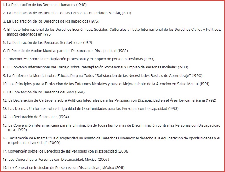 Pero fue hasta que aparecieron el Plan de Acción Mundial para las Personas con Discapacidad (1982), las Normas Uniformes para la Equiparación de Oportunidades de las Personas con Discapacidad (1993), y la Convención Americana para la Eliminación de todas las Formas de Discriminación contra las Personas con Discapacidad (1999), cuando ocurre en realidad un cambio paradigmático en torno a la visión hegemónica de la discapacidad.