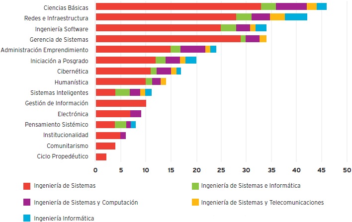 A partir de la información contenida en el estudio de mercado de Giraldo-Escobar y Correa-Henao (2015), se puede inferir el énfasis de formación de los programas de Ingeniería de Sistemas y afines, con mención de calidad por el MEN, cuyo resumen se puede apreciar en la Figura 2.