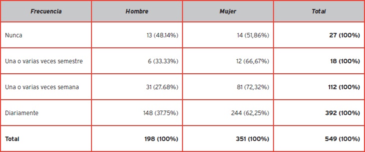 Respecto a las relaciones identificadas entre el género y la frecuencia de realización de la tarea de tomar apuntes, las mujeres tienden a obtener porcentajes más altos en las diferentes opciones de respuesta, excepto en la opción "nunca" donde hombres y mujeres obtienen porcentajes similares. Esto apunta a una mayor frecuencia de toma de apuntes en las mujeres, aunque estas diferencias no son significativas desde el punto de vista estadístico (ver Tabla I).