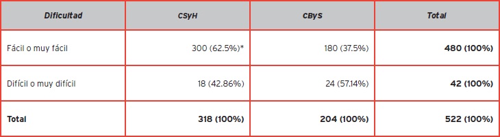 Respecto a la dificultad que atribuyen los estudiantes en función del área de conocimiento a la que pertenecen, a los estudiantes del área de Ciencias Sociales y Humanidades les parece fácil o muy fácil la tarea de tomar apuntes en mayor medida que a sus compañeros de Ciencias Biológicas y de la Salud (χ2 =6.259, gl=1, p=0.012) (ver Tabla X).