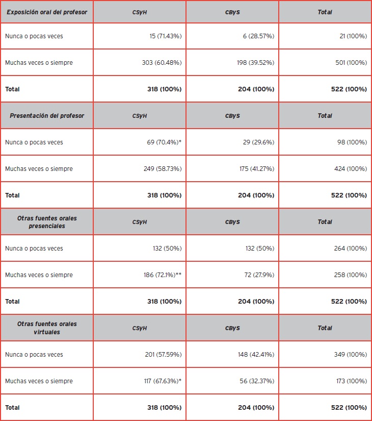 Finalmente, respecto de la procedencia de la información incluida en los apuntes, se observan diferencias significativas entre los estudiantes de ambas áreas de conocimiento en el uso de información proveniente de la presentación del profesor, menos frecuente en los estudiantes de CSyH (χ2 =4.563, gl=1, p=0.033) y en una mayor frecuencia de uso en estos estudiantes de fuentes orales presenciales (χ2 =26.751, gl=1, p=0.000) y virtuales (χ2 =4.894, gl=1, p=0.027), respecto de sus compañeros de CByS (ver Tabla XI).