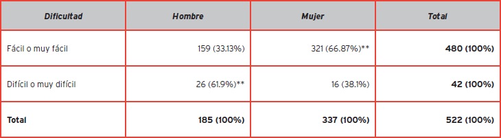 En cambio, cuando se trata de considerar la dificultad de la toma de apuntes, las mujeres se representan dicha tarea como fácil o muy fácil en mayor medida que los hombres, los cuales se la representan como difícil o muy difícil en mayor medida que ellas (χ2 =13.981, gl=1, p=0.000) (ver Tabla II).