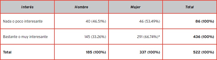 Los resultados también muestran diferencias significativas respecto del interés que suscita la toma de apuntes en hombres y mujeres. En ese sentido, las mujeres tienden a considerarla bastante o muy interesante en mayor medida que sus compañeros los hombres (χ2 =5.516, gl=1, p=0.019) (ver Tabla III).