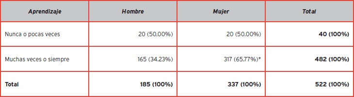 Cuando se les pregunta a los estudiantes si la toma de apuntes les sirve para aprender los contenidos de la materia las mujeres dicen que así es muchas veces o siempre en mayor medida que sus compañeros hombres (χ2 =4.013, gl=1, p=0.045) (ver Tabla IV).