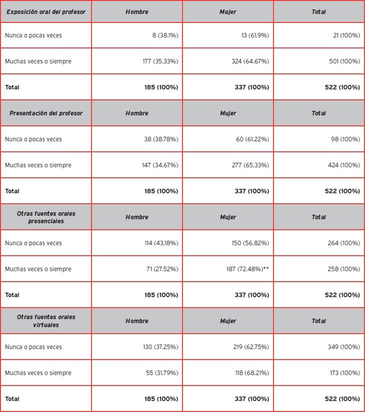 Finalmente, preguntamos a los estudiantes por la procedencia de la información utilizada durante la toma de apuntes, refiriéndonos a si ésta procede de la exposición oral del profesor, la presentación utilizada por el profesor (Power Point, Prezi...), otras fuentes orales presenciales (debates, conferencias...) u otras fuentes orales virtuales (conferencias, entrevistas...). En todas las opciones de respuesta que se dieron para identificar la procedencia de la información utilizada durante la toma de apunte los porcentajes siempre fueron superiores en las mujeres, aunque sólo de forma significativa cuando se trata de incluir información en los apuntes procedente de otras fuentes orales presenciales. En estos casos, las mujeres dicen en mayor medida que los hombres que utilizan este tipo de fuentes muchas veces o siempre (χ2 =13.990, gl=1, p=0.000) (ver Tabla V).