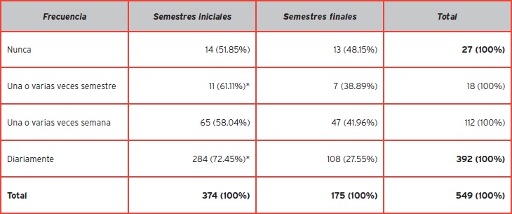 El semestre cursado por los estudiantes ha sido otra de las variables que hemos contemplado en el estudio. En este sentido, los resultados obtenidos nos muestran que los estudiantes de los primeros semestres dicen tomar apuntes con mayor frecuencia que los de los semestres finales. Consideran la toma de apuntes como una tarea que les permite muchas veces o siempre aprender los contenidos de las materias también en mayor medida que sus compañeros de semestres más avanzados y dicen utilizar la presentación del profesor como fuente de información prioritaria durante la toma de apuntes también con una frecuencia mayor que sus compañeros de los semestres finales. Estos resultados se alejan de los obtenidos en investigaciones como las realizadas por Solé et al. (2005: 341) donde las autoras observan, por ejemplo, que la valoración de la toma de apuntes aumenta con el nivel educativo; o por las investigaciones realizadas por Marugán, Martín, Catalina y Román (2013: 18), los cuales identifican una tendencia de mayor uso de este tipo de recursos en los estudiantes que se encuentran en los cursos finales de sus estudios.