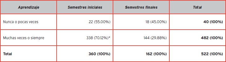 En cambio, se observan diferencias significativas respecto del aprendizaje que dicen que les genera la toma de apuntes a los estudiantes según el semestre cursado. Así, los de los semestres iniciales consideran la toma de apuntes como una tarea que les permite aprender los contenidos de las materias en mayor medida que sus compañeros de los semestres finales (χ2 =3.947, gl=1, p=0.047) (ver Tabla VII).