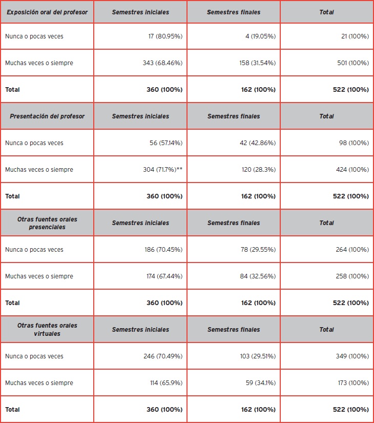 Finalmente, en relación con la procedencia de la información que utilizan los estudiantes durante la toma de apuntes en función del semestre cursado, se observa que en general los estudiantes de los primeros semestres tienden a preferir en mayor medida que sus compañeros de los semestres finales los diferentes usos de fuentes de información contemplados (exposición oral y presentación del profesor y otras fuentes orales o virtuales de información), aunque estas diferencias sólo son significativas en el uso de la presentación del profesor como fuente de información prioritaria durante la toma de apuntes, donde los estudiantes de los semestres iniciales dicen utilizarla muchas veces o siempre en mayor medida que sus compañeros de los semestres finales (χ2 =7.879, gl=1, p=0.005) (ver Tabla VIII).