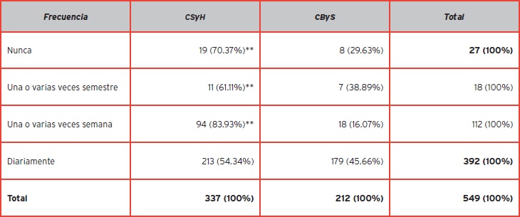 La tercera variable contemplada refiere al área de conocimiento de los estudiantes. En este sentido, cuando se relaciona la frecuencia en la toma de apuntes con esta variable se observan diferencias significativas entre los estudiantes de las dos áreas contempladas. Concretamente, los estudiantes de Ciencias Sociales y Humanidades (CSyH) dicen tomar apuntes nunca, una o varias veces por semestre y una o varias veces por semana en mayor medida que los estudiantes de Ciencias Biológicas y de la Salud (CByS) (χ2 =33.148, gl=3, p=0.000) (ver Tabla IX).