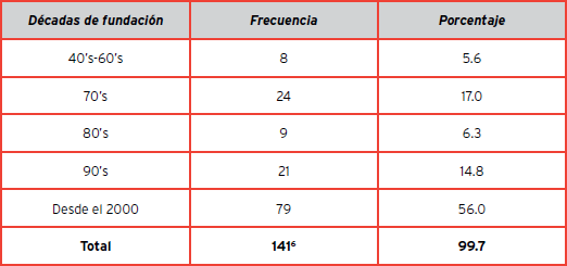 En lo que refiere a los años de fundación de las sedes, en la Tabla 1 se puede ver que, después de los años setenta, el número de sedes no creció mucho durante “la década perdida”, pero aceleró su crecimiento a partir de los noventa y especialmente desde el inicio del siglo XXI.