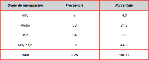 La expansión de las UA mediante la creación de sedes desconcentradas ha contribuido a la ampliación geográfica de la oferta de ES, ya que un porcentaje importante de las nuevas sedes se ubican en municipios con pocas opciones para ingresar a la ES. Esta tendencia es históricamente nueva: la mayoría de estas sedes de las UA se han abierto a partir del año 2000, lo que significa que en los municipios donde se localizan no había oferta de ES antes de ese año, o en dado caso se han cerrado otras opciones, si es que existieran previamente. Los contextos socioeconómicos donde se instalan las sedes de las UA son favorables, la gran mayoría de los municipios tienen bajo a muy bajo grado de marginación. A pesar de ello se localizaron cuatros sedes en municipios con muy alto grado de marginación y otras nueve con alto grado de marginación.