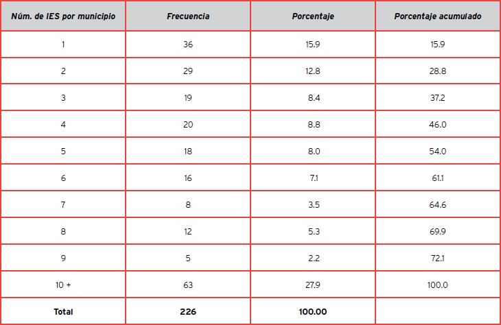 Ante dicha problemática, la expansión geográfica de cobertura de la ES se ha introducido como tema de importancia en la política educativa mexicana, con el fin de expandir oportunidades educativas hasta municipios poco urbanizados que han carecido de oferta de ES. Entre 1990 y 2010 se aumentó el número de municipios que contaba con una IES de 159 a 431 (Didou, 2011), y los datos más recientes de la SEP (ciclo escolar 2013-2014) indican que ya eran 653 los municipios los que contaban con al menos una IES (SEP, 2015b). Cabe destacar que, de los 653 municipios, aproximadamente 32% tiene sólo una escuela de ES, y un poco más de la mitad tiene hasta dos (SEP, 2015b), de tal forma que la expansión geográfica de la cobertura de ES ha empezado a llegar a municipios con poco acceso a la ES, o bien los desiertos educativos (Hillman y Weichman, 2016).