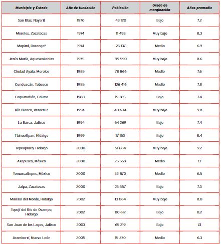 En la Tabla 4 se presenta una descripción general de las 36 sedes de las UA donde son la única opción de ES en el municipio. La tabla presenta el estado y municipio de localización, el año de fundación, así como el grado de marginación y los años promedio de escolaridad.