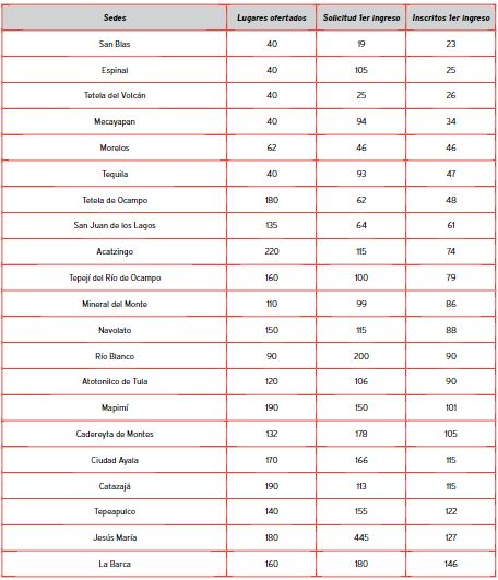 Los otros casos que rompen con el patrón general son aquellas IES en los que el número de solicitudes sobrepasa al número de lugares ofertados, pero aún en estos casos el número de estudiantes de nuevo ingreso sigue siendo menor al de los lugares ofertados. Los casos con este comportamiento son: Jesús María (Aguascalientes), Tlahuelilpan (Hidalgo), Axapusco (Estado de México), Jonacatepec (Morelos), Cadereyta de Montes (Querétaro), Contla de Juan Coamatzi (Tlaxcala) y Río Blanco (Veracruz). Estas cifras también indican un filtro, entre el proceso de solicitud y la admisión, así como la potencial falta de aprovechamiento de lugares ofertados.