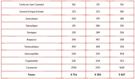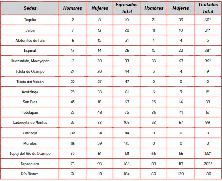 Una vez más saltan a la vista los casos extremos, Jalpa (Zacatecas), con 20 egresados y Cunduacán (Tabasco), con 2 333 egresados durante los cuatro ciclos escolares. Asimismo, en cuanto a los titulados, mientras que Cunduacán cuenta con más de 2 000, hay tres casos, Morelos (Zacatecas), Tetela del Volcán (Morelos) y Catazajá (Chiapas), donde hay egresados pero ningún titulado. Algo similar sucede con las sedes de Atotonilco de Tula (Hidalgo) y Tetela de Ocampo (Puebla), que reportan tan sólo cinco y nueve titulados respectivamente. La misma tendencia muestran las sedes de Mapimí (Durango) y Contla de Juan Cuamatzi (Tlaxcala), de donde egresaron 339 y 210 alumnos respectivamente, pero sólo se titularon 34 y 33, en este periodo.